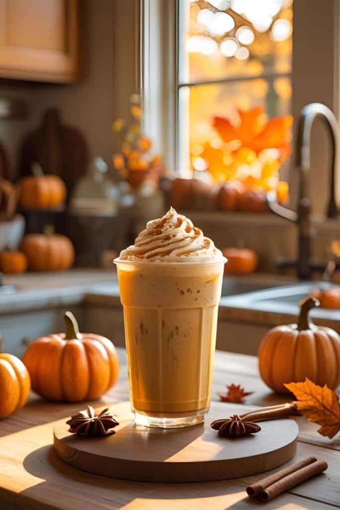 Smooth espresso or strong coffee is blended with creamy milk, pumpkin puree, and a swirl of warm spices, then poured over ice for a seasonal sip that’s both invigorating and comforting.
